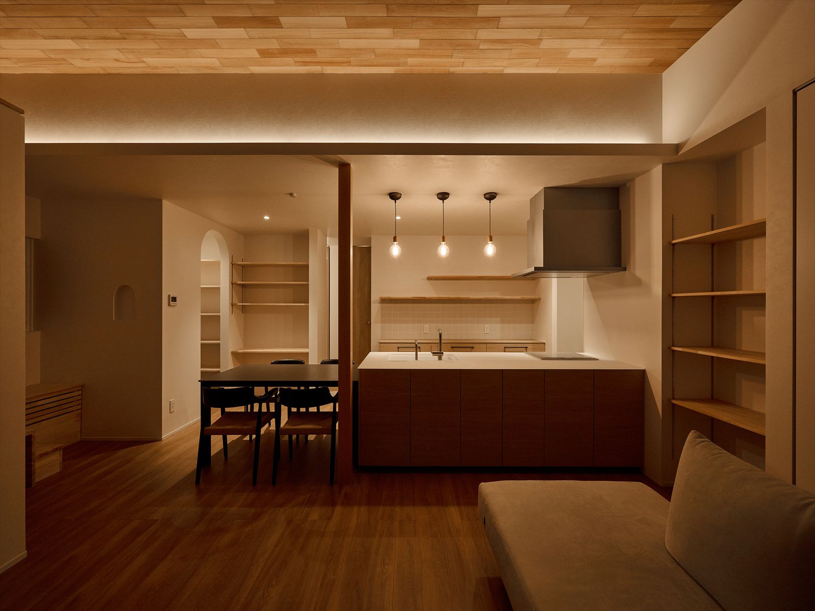 昼は自然光が心地よく差し込み、夜はやわらかな光が空間を包み込む。