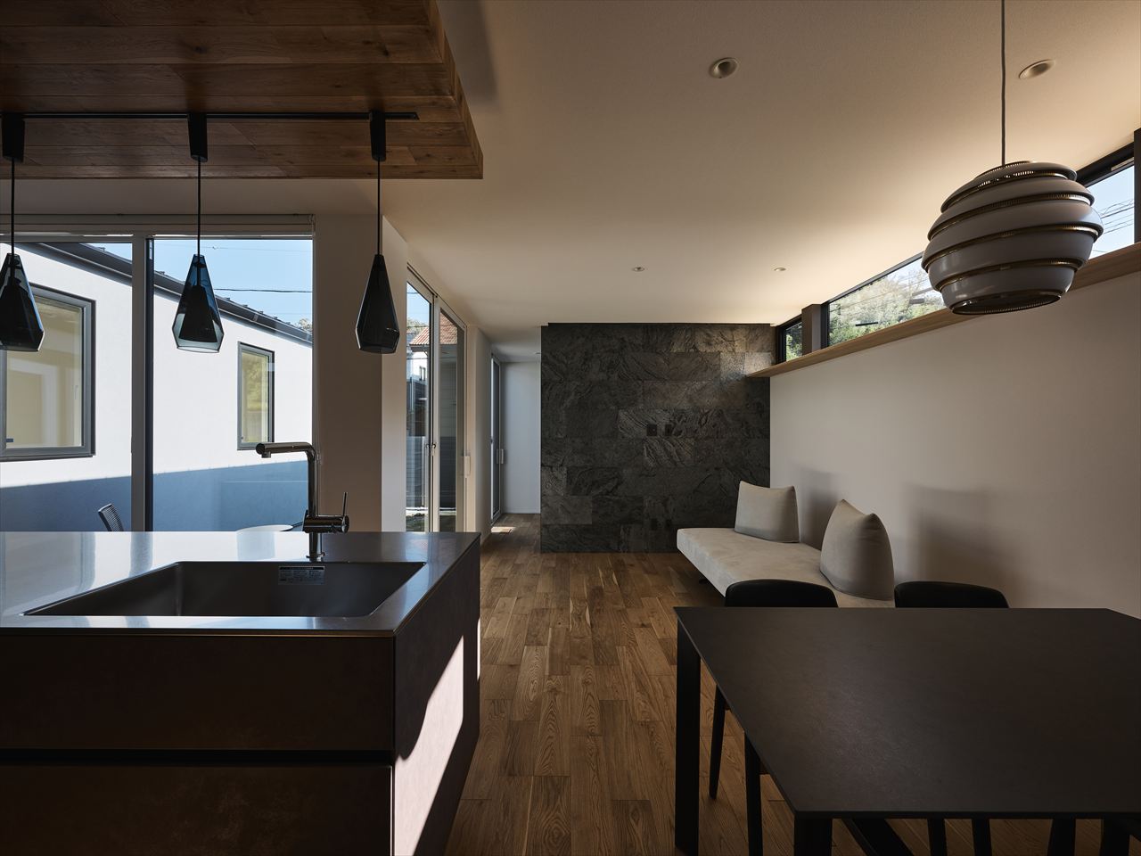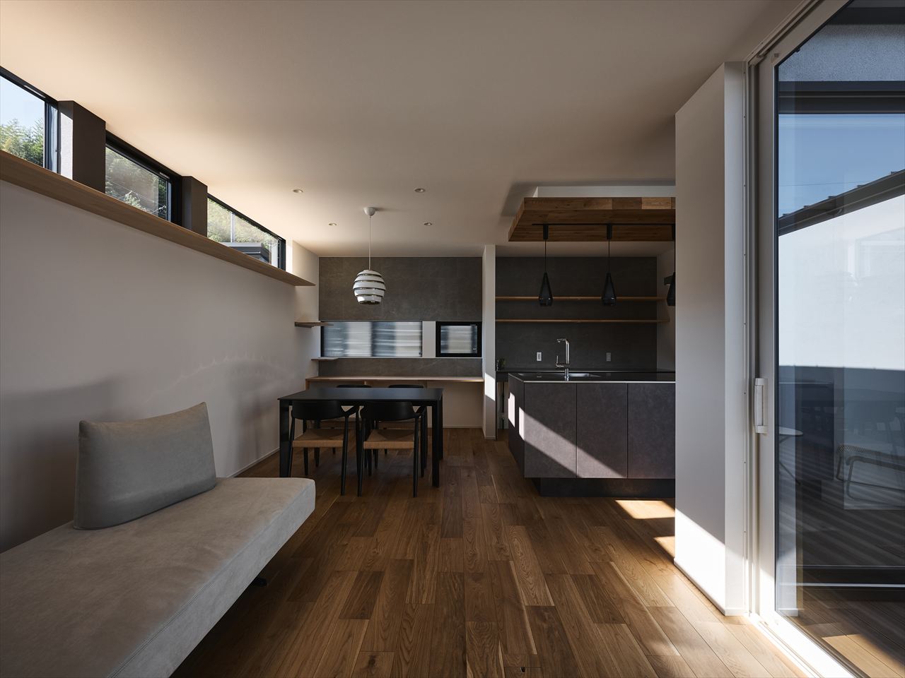 天井際の高窓から光を招き入れるLDK。