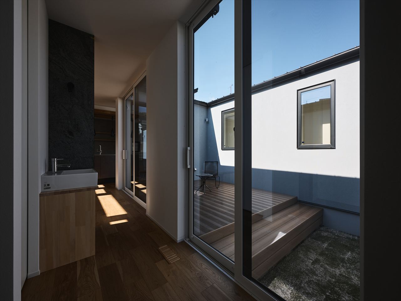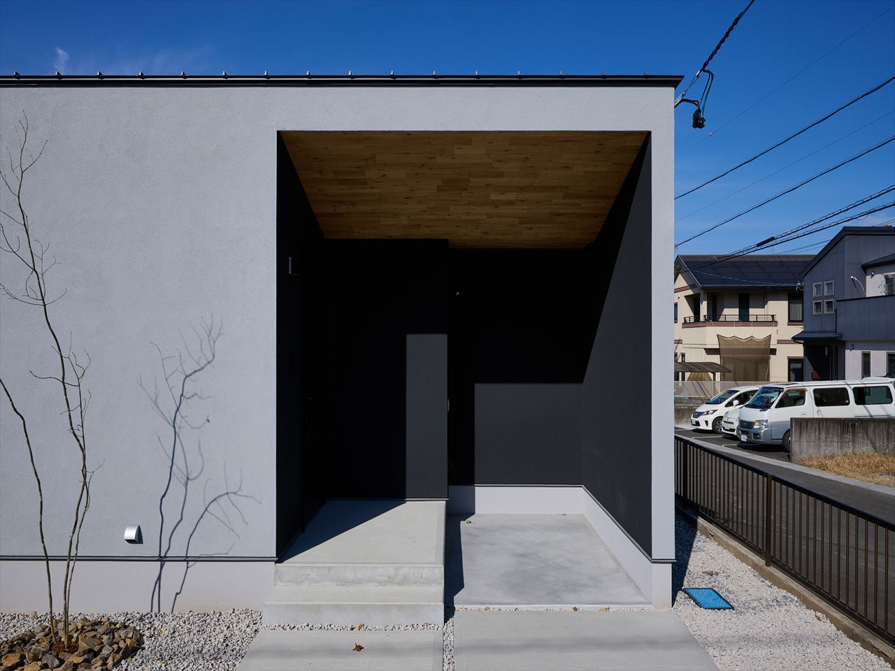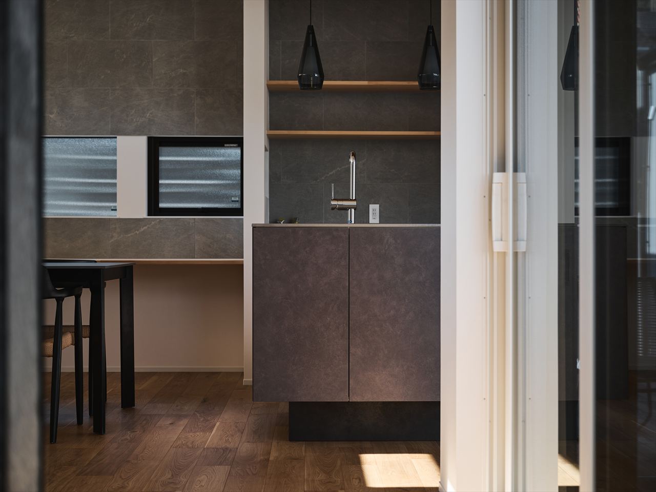 グレーのタイル壁による素材の対比。