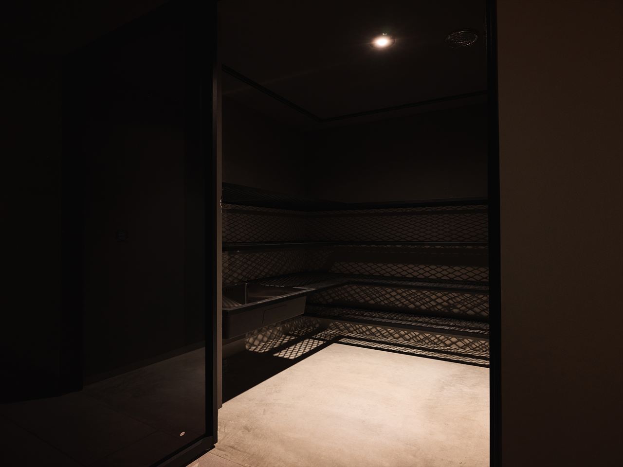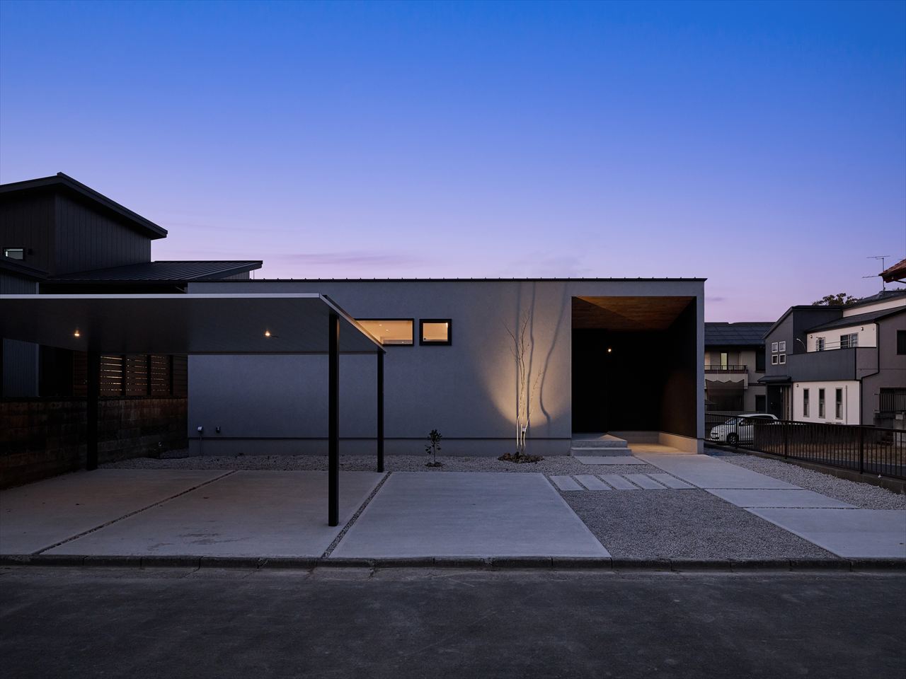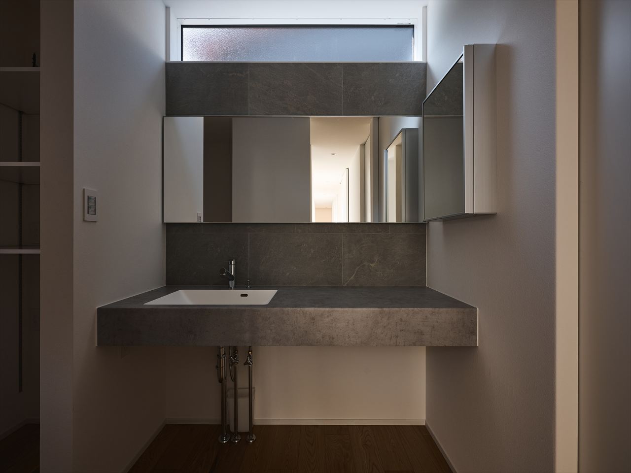 グレーのタイル壁による素材の対比。